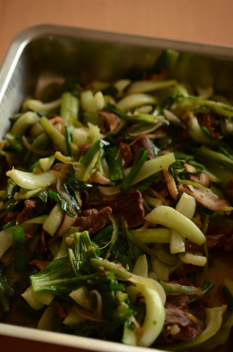 青梗菜、ニラ、ピーマン、玉ねぎ、椎茸、牛肉で肉野菜炒めも作りました。