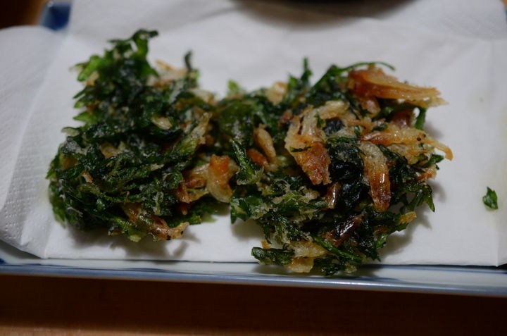 そして、春菊は葉をむしってざく切りにし、桜海老と粉をまぶしてかき揚げにしました。
