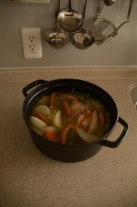 キャベツ、玉ねぎ、かぶ、にんじん、ベーコン、ウィンナー でポトフを作りました。出汁には、頭とワタを取った煮干しを使いました。濃いうまみが出てすごくおいしかったです。