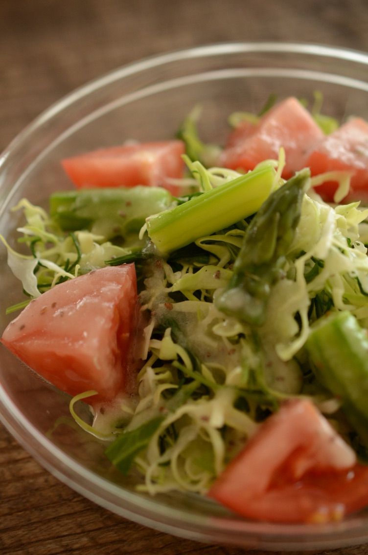 せん切りキャベツにゆでたおかひじきを混ぜて、アスパラガス、トマト とサラダにしました。