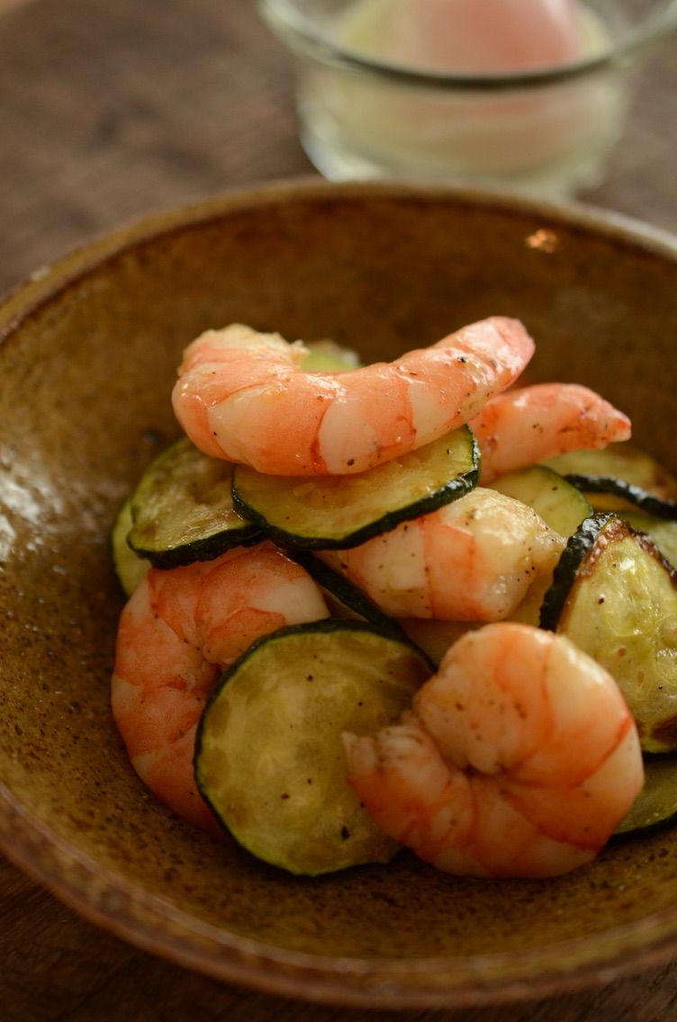 ズッキーニは海老とオリーブオイル炒めにしました。