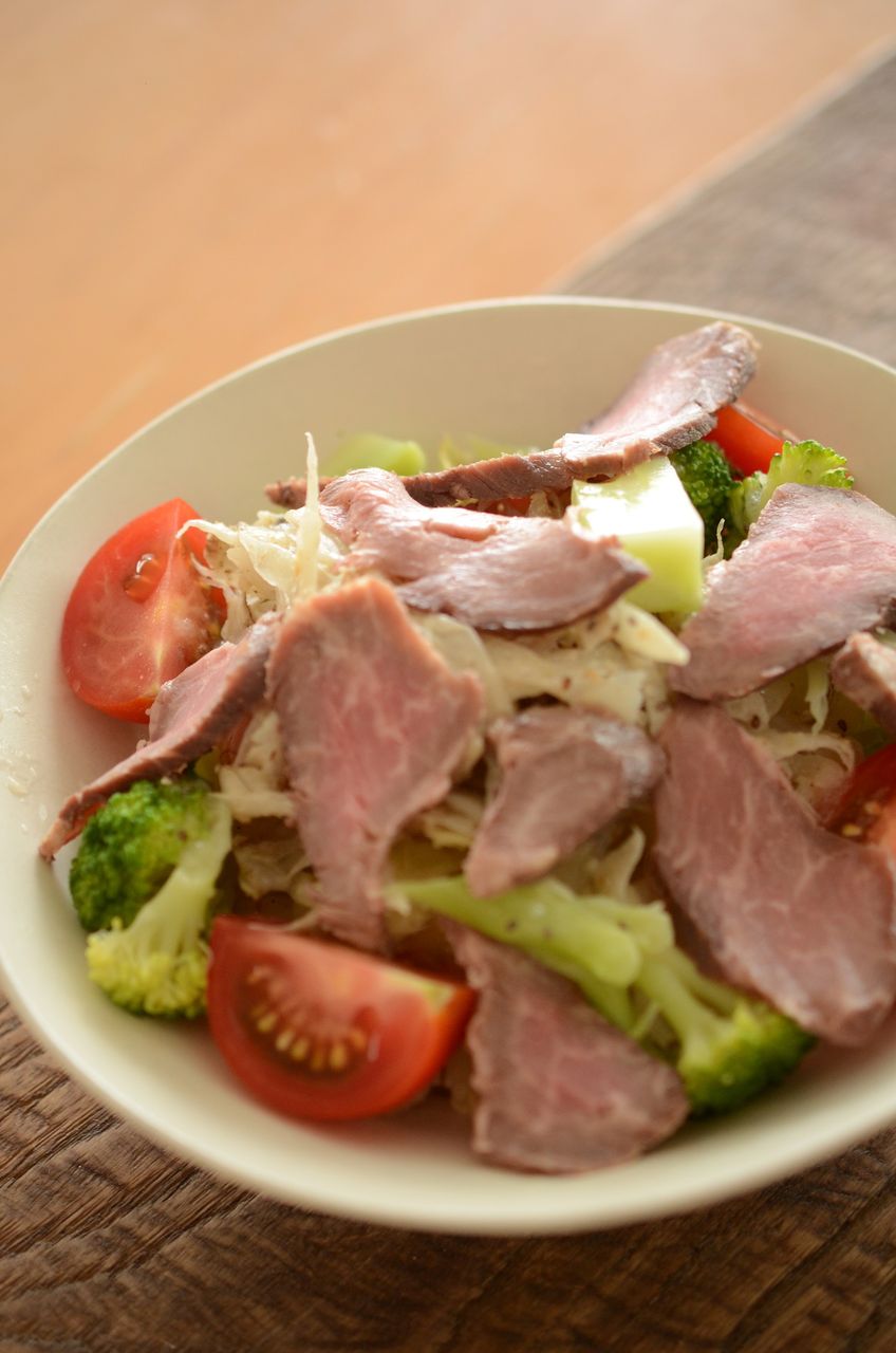 そして、ブロッコリー、レタス、きゅうり、トマト でサラダを作り、上には、少し前にまとめて仕込んだローストビーフをのせました。贅沢サラダです。