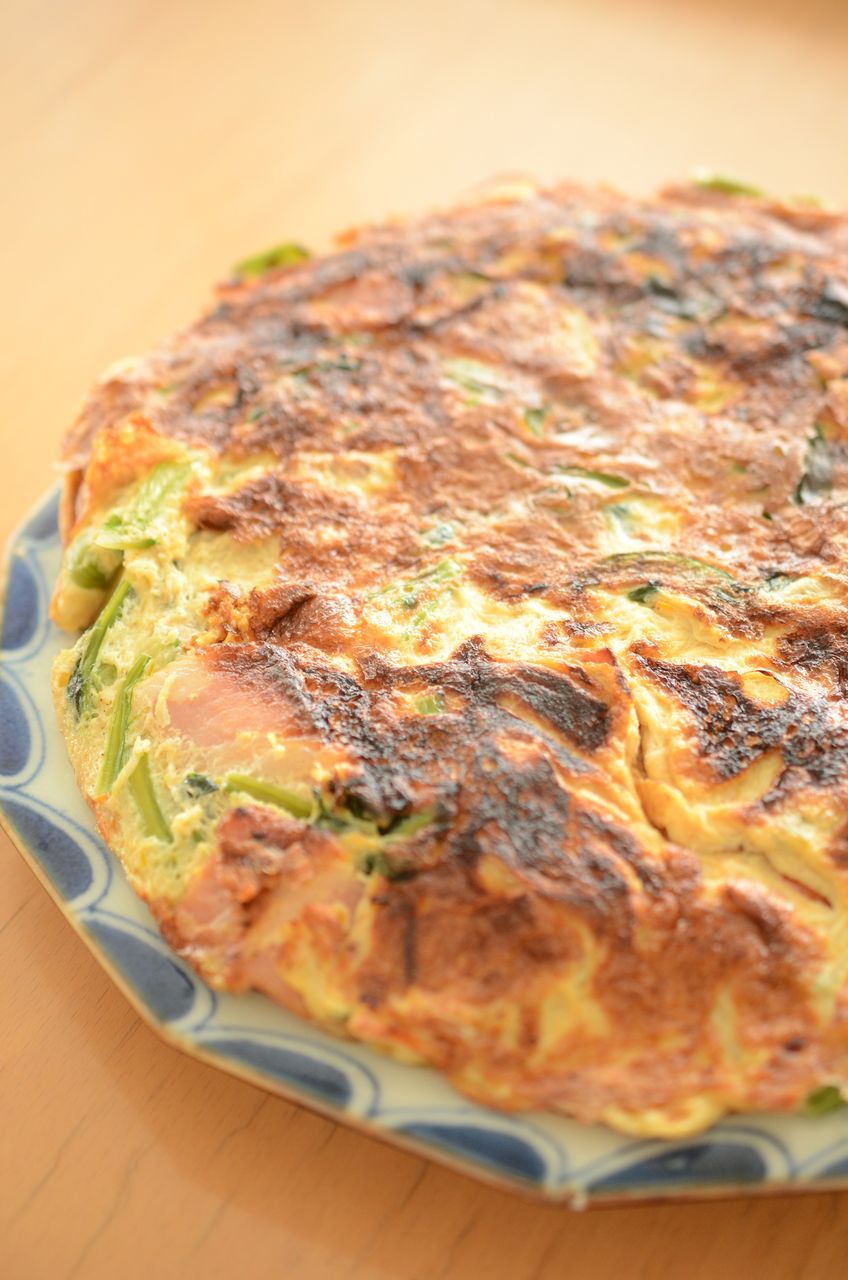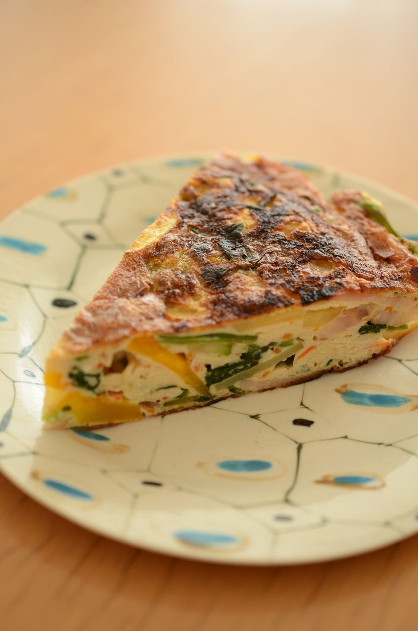 卵、ベーコン、じゃがいも、南瓜のかけら、人参、ピーマン、ズッキーニ、ほうれん草 でスペイン風オムレツを作りました。