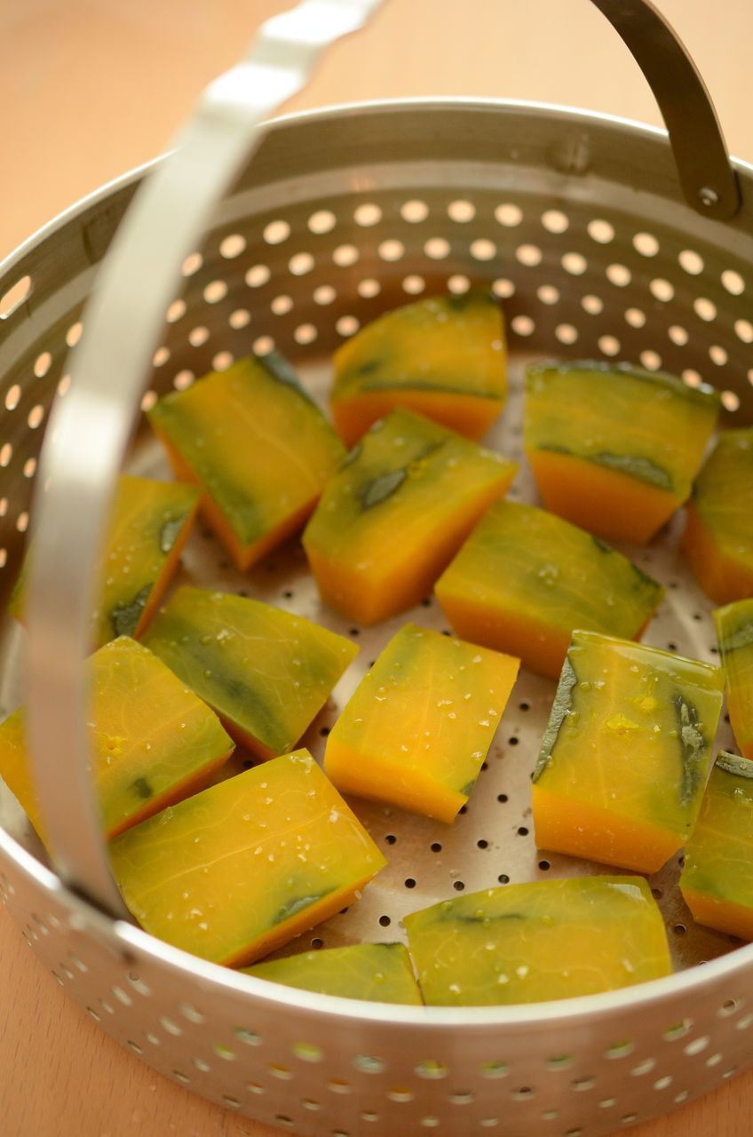 南瓜は駒の形に切り出して蒸し、あがりに塩を振りました。