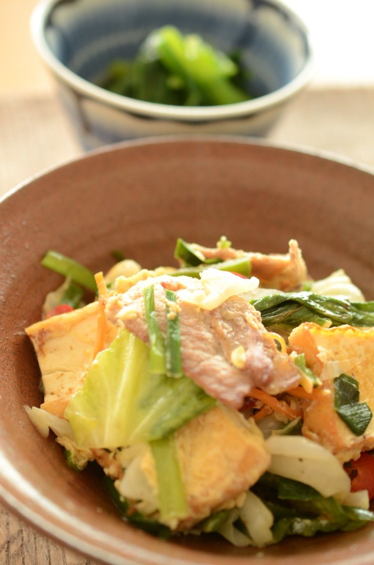 豚肉、厚揚げ、卵、かつお節削り節、ニラ、キャベツ、にんじん、ピーマン、パプリカ、長葱 でチャンプルーを作りました。