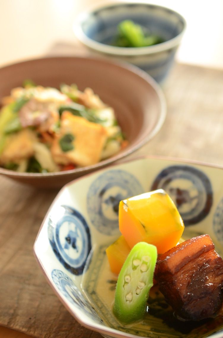 南瓜は出汁で静かに煮ました。豚ばら角煮はANOVA precision cooker で低温調理して冷凍しておいたもの(脂身がまだ固い状態)を煮直して、丸オクラと盛り付けました。