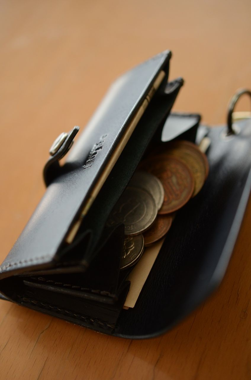 開くと、小銭入れがあり、その下をくぐらせようにして、二つ折りの紙幣をしまえます。小さいのにスムーズで使いやすいから感心します。