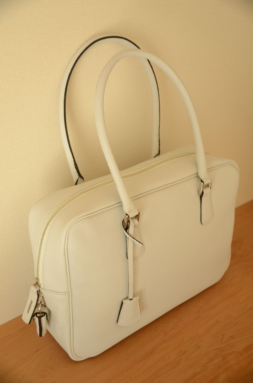 白いレザーボストンです。以前から欲しいと思っていた白いバッグ、シンプルなのに、革の質感と端の処理がすごく良くて満足しました。