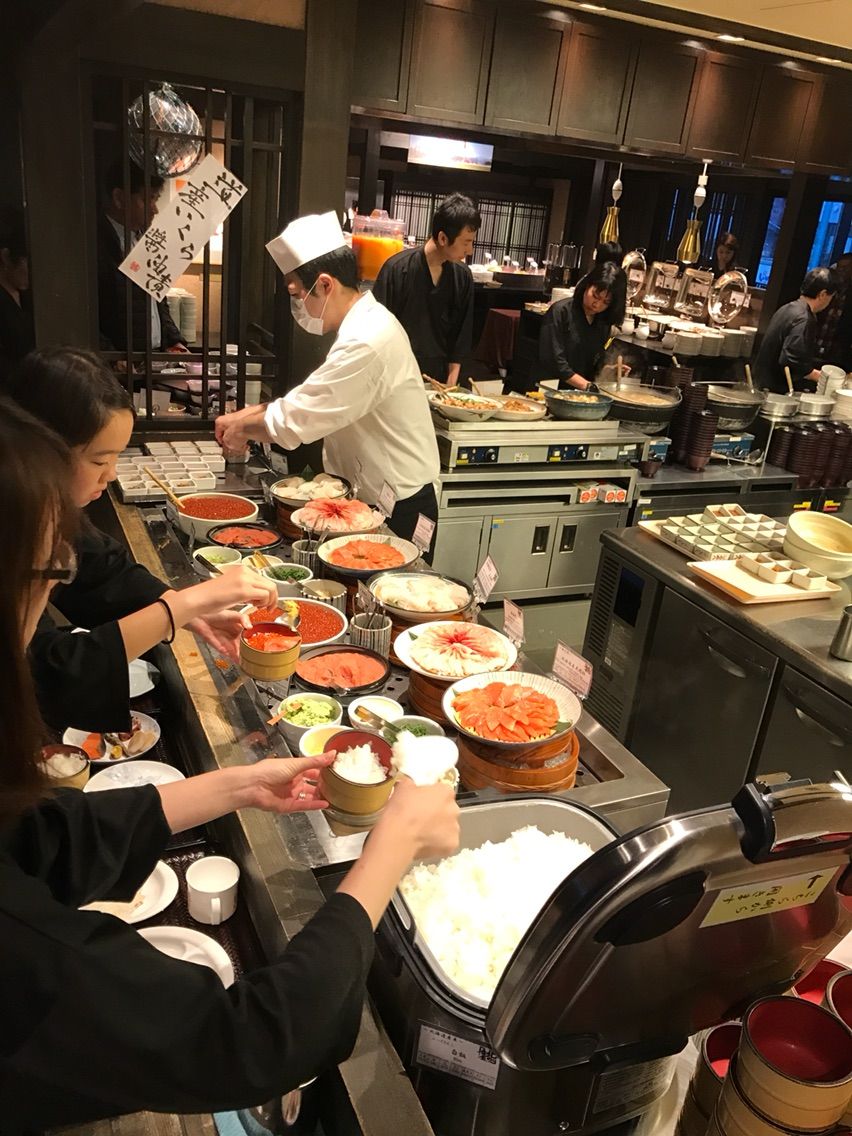 そしてきわめつけは朝食です。ブッフェなんですが、海鮮丼作り放題なんです。だから朝6時からこの熱気でした。