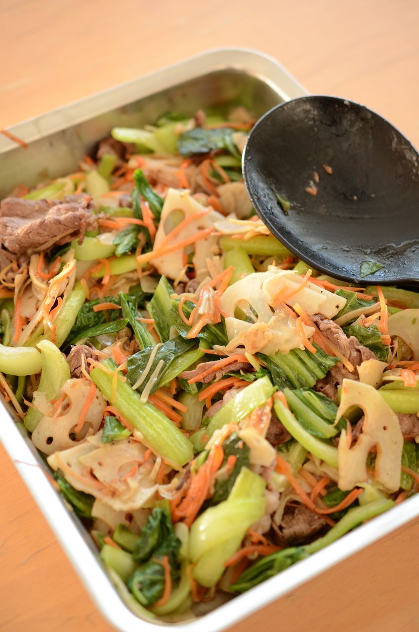 牛肉、チンゲン菜、キャベツ、にんじん、れんこん、えのきだけ で肉野菜炒めも作りました。