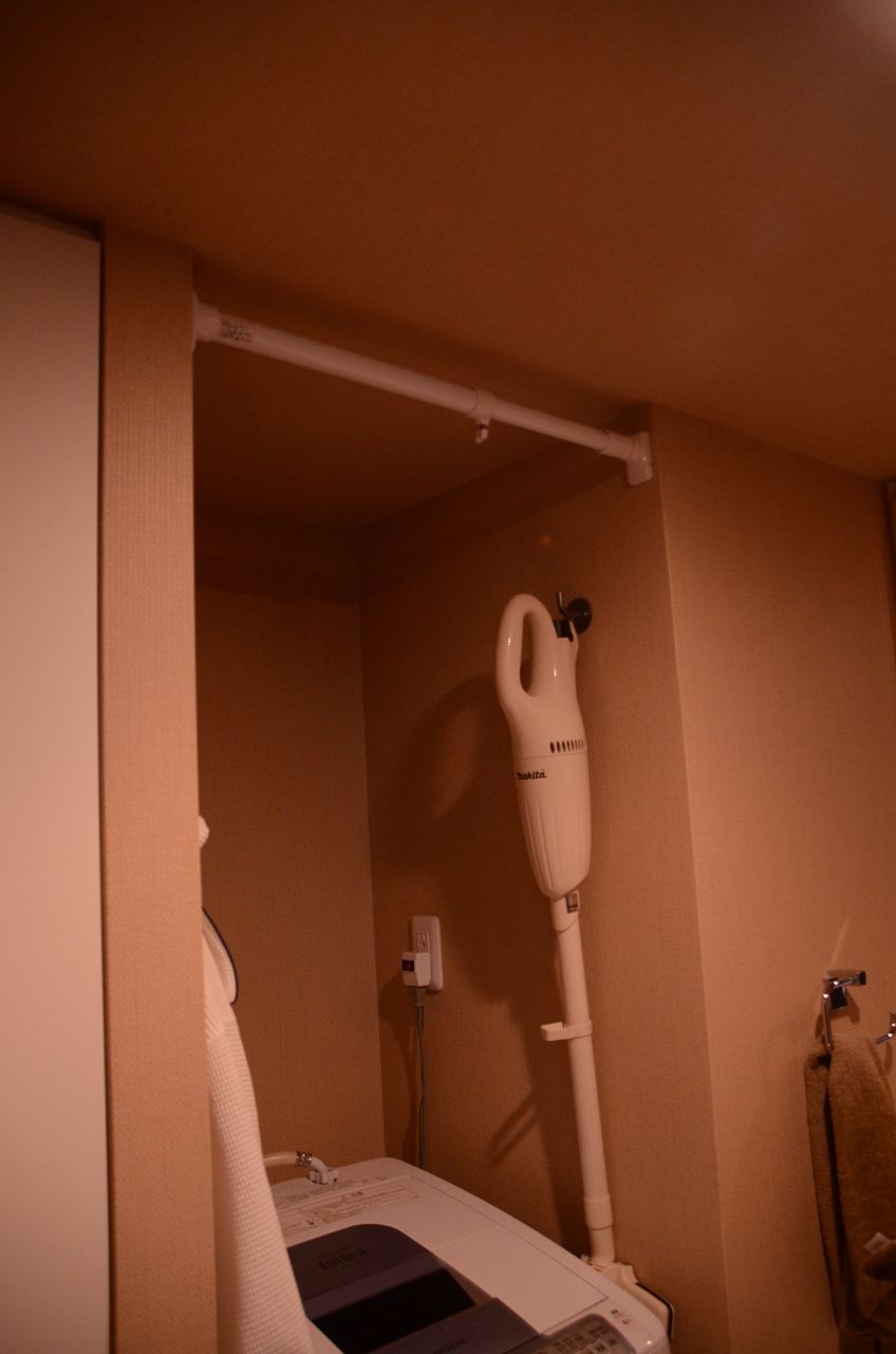 そこで、洗濯機の真上に強力突っ張り棒を設置して、ここで洗濯物を干し具にかけることにしました。