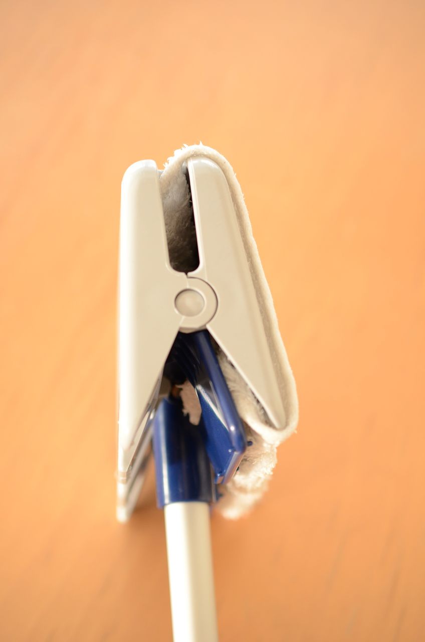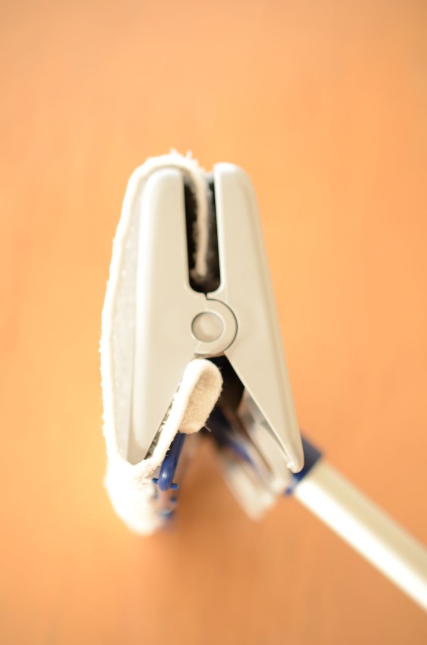 片側が大きなクリップになっており、濡らして絞ったぞうきんを挟み込み、反対側は青いレバーで固定するようになってます。