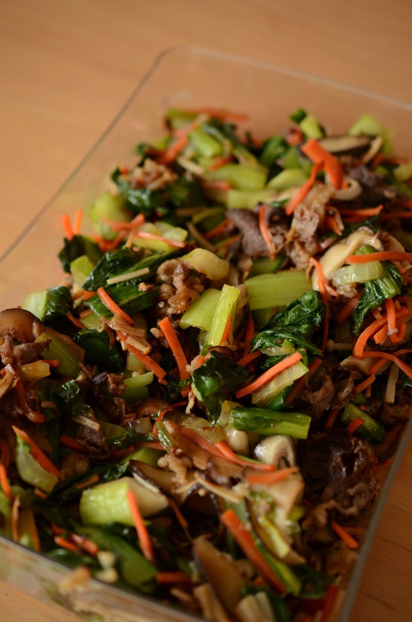 牛肉、小松菜、白菜、えのきだけ、椎茸、人参 で肉野菜炒めも作りました。