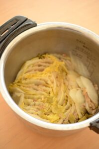 鶏胸肉、白菜、ココナッツミルク、ターメリック、クミンパウダー、レッドペパー、レモングラス、ミニトマト でグリーンカレーを作りました。象印のIH圧力なべを使いました。
