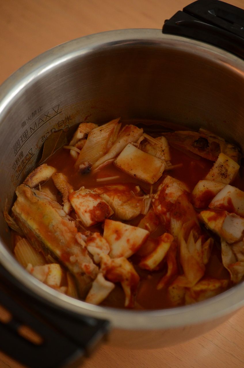 5. 象印のIH圧力なべにホウボウの頭と骨、身、炒めにんにく玉ねぎ、ワイン、有機トマトピューレ、塩小さじ1/2 を加え、ブイヤベースのメニューを選択してスタートボタンを押します。