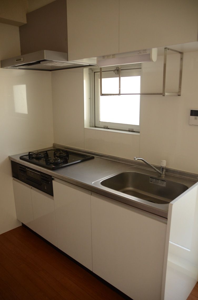 該当。コンパクトな物件にしては珍しく、3つ口ガスコンロのシステムキッチンです。換気扇はシロッコファン、排水口も大口径のしっかりしたものでした。しかもキッチンに小窓が付いていました。ガラスドアもあって明るいです。キッチンとダイニングで6畳と結構広々しています。