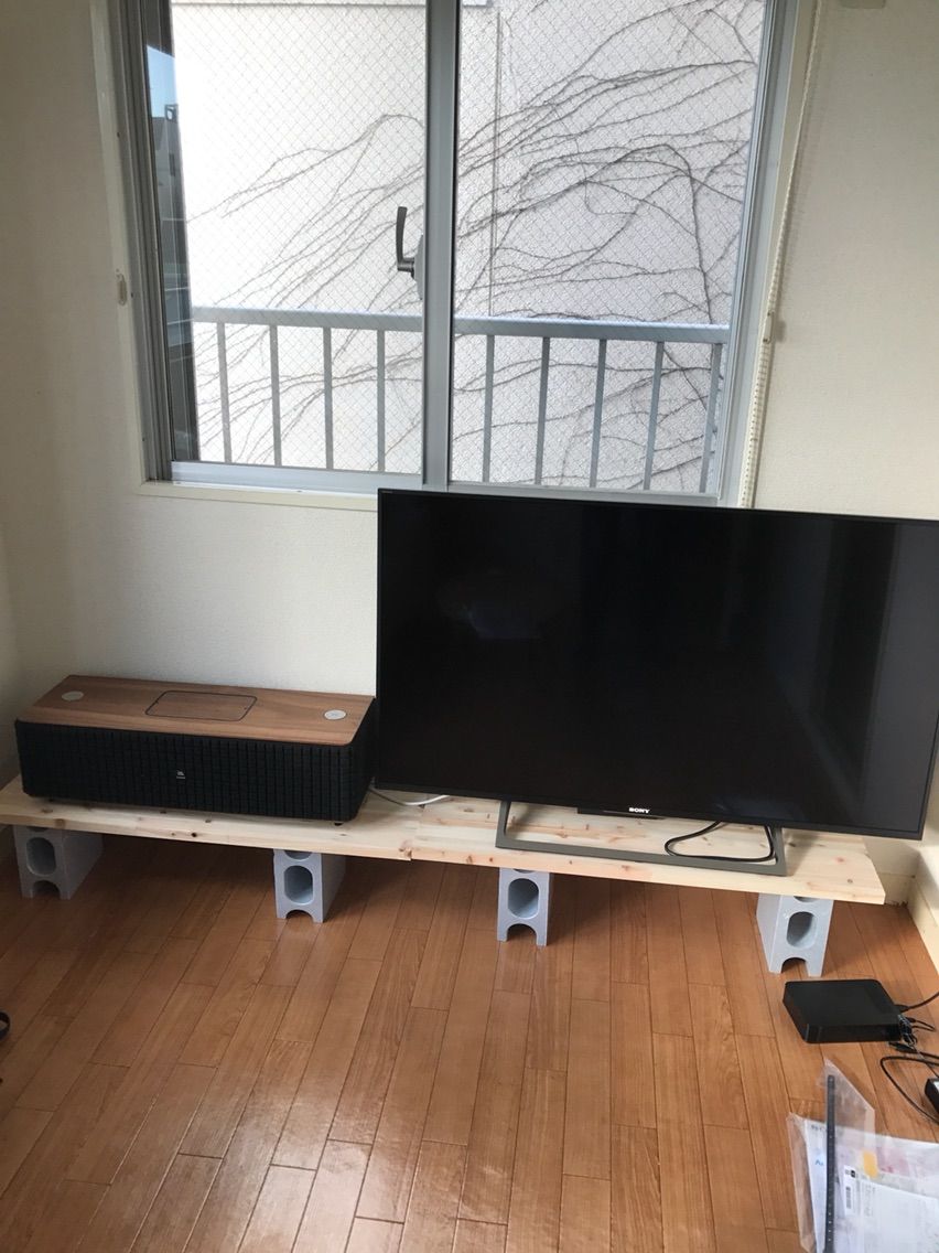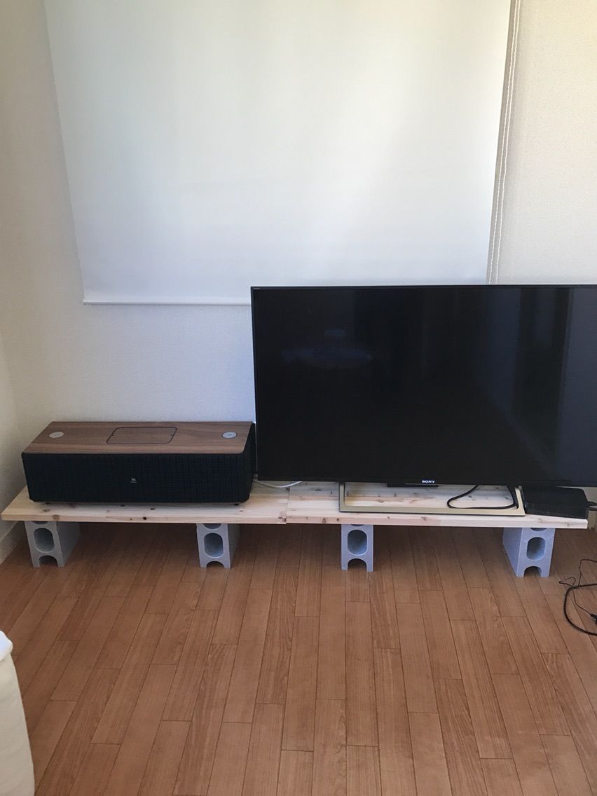 テレビ台もこだわりたかったのですが、市販品でお気に入りのものが見つからなかったので、とりあえず板と発泡スチロールブロックで自作しました。