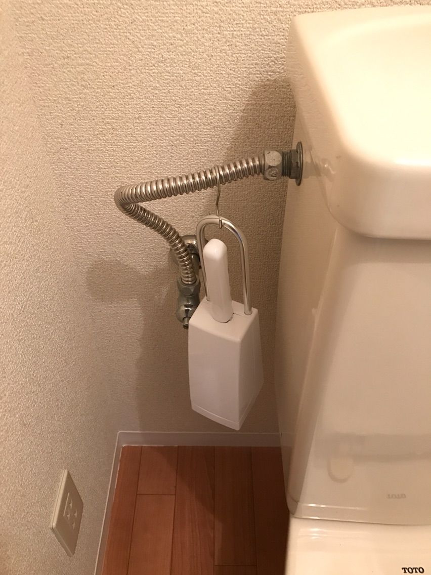 トイレでトイレブラシを吊るすS字フック(ダイソー)です。ブラシを宙づりにすることで、床掃除が劇的にラクになりました。
