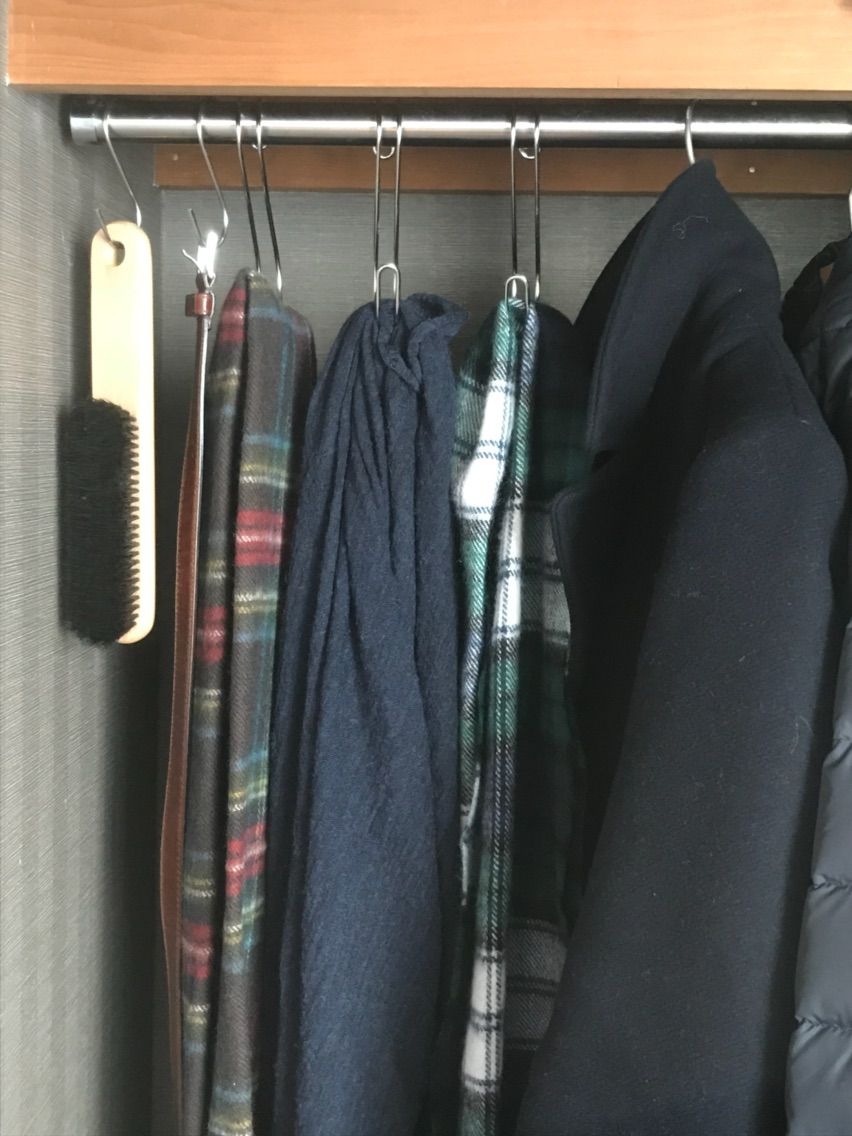 クローゼットの扉に付けたコート掛け(無印良品)です。脱いだばかりのコートを掛けて蒸気を放出させます。そのあとブラシもかけられます。