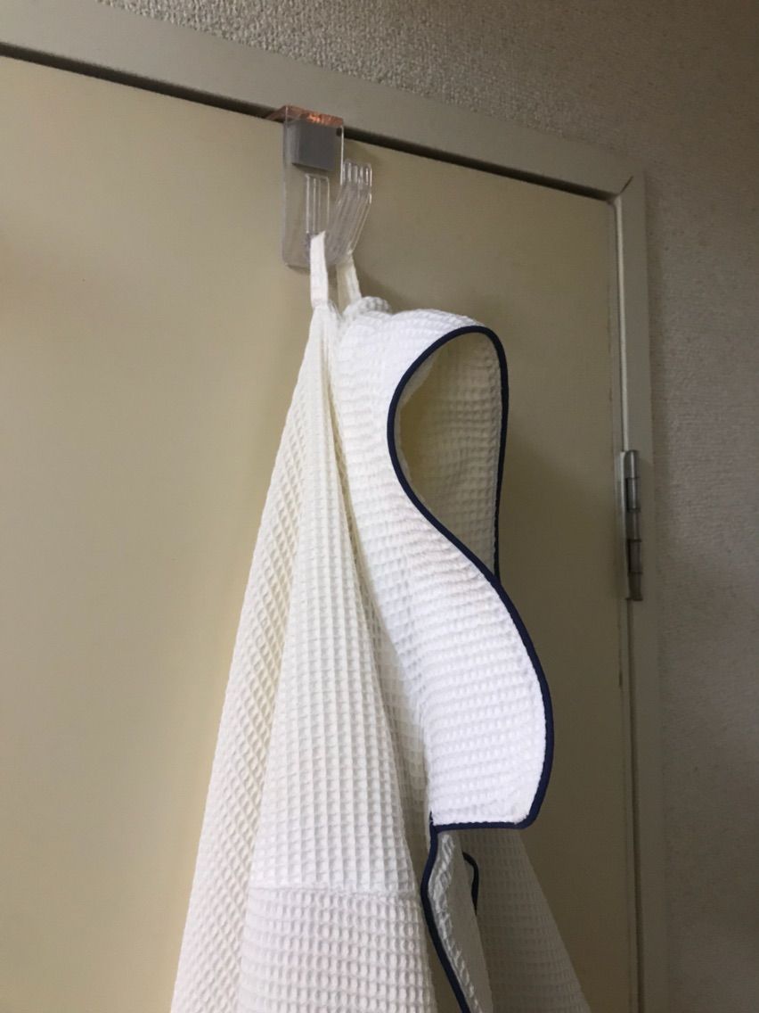 お風呂の隣のトイレの扉にはフックを差して、バスローブをかけています(キャンドゥ)。