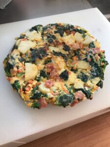 ベーコン、ほうれん草、人参、長ねぎ、じゃがいも、卵 でスペイン風オムレツを作りました。