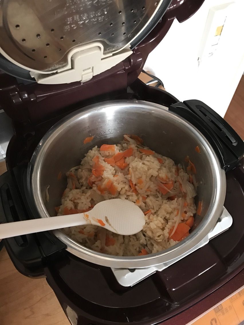 ごぼう、人参、鶏肉 で炊き込みご飯も作りました。象印のIH圧力なべを使いました。おいしく炊き上がり、息子にも大好評でした。