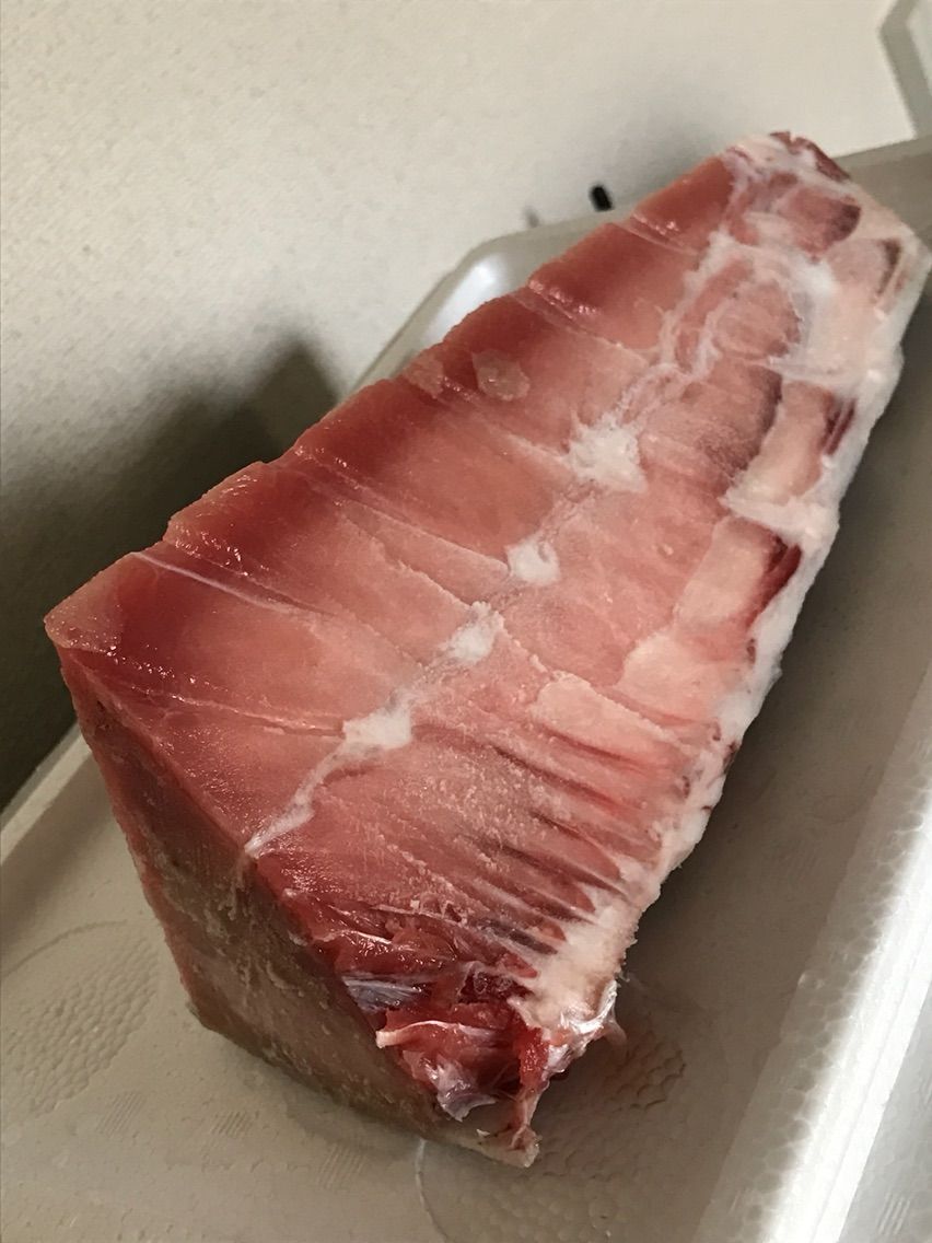 半解凍してからサクを切り出して解凍し、マグロ丼にして食べました。