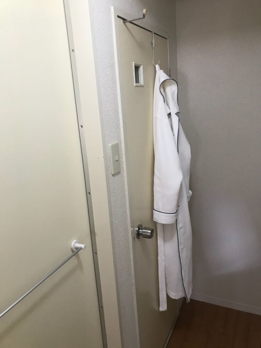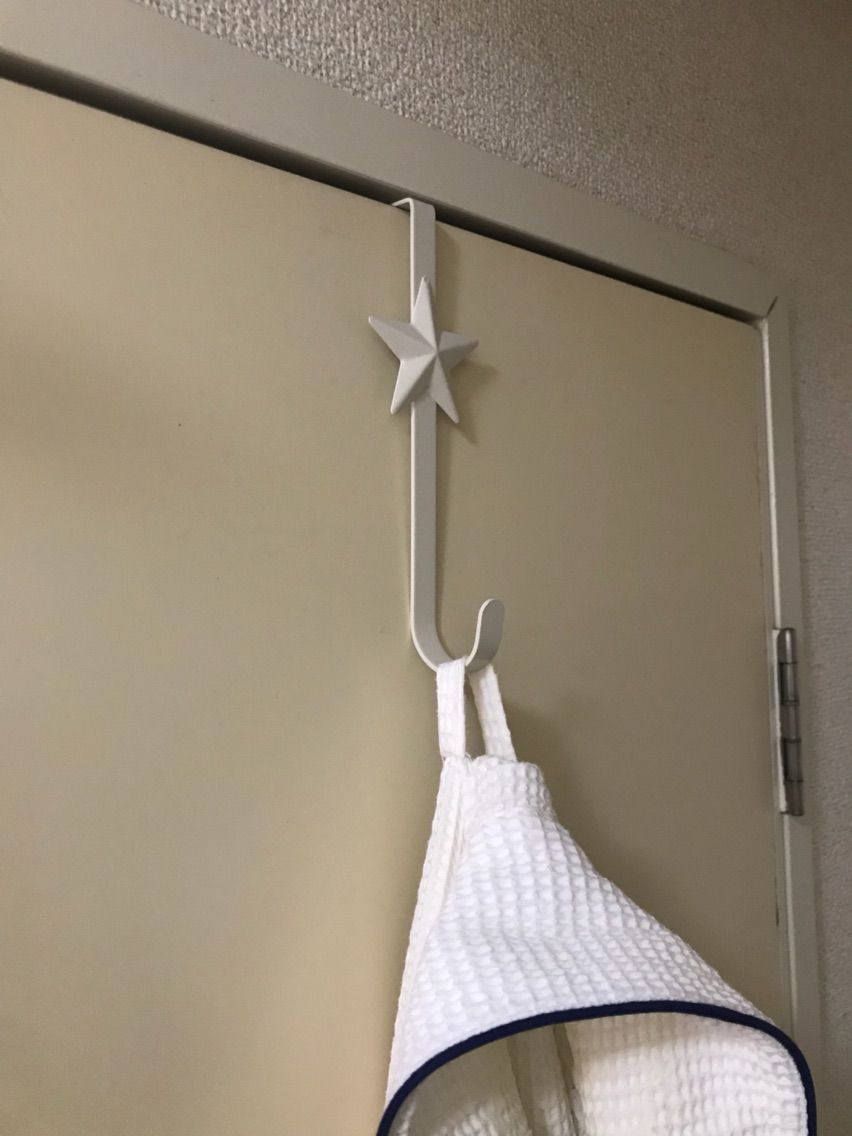 お風呂上がりにすぐ手に取れるよう、新居ではお風呂の隣のトイレのドアにフックを付けてひっかけています。