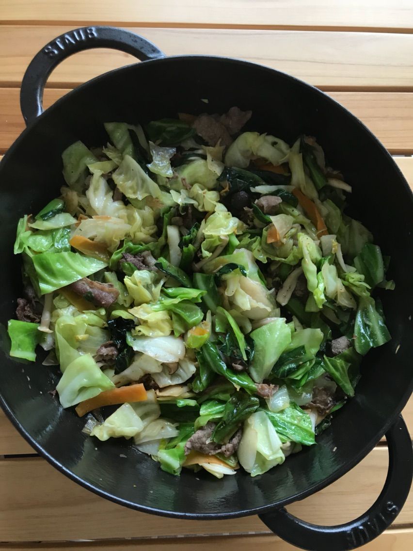 キャベツ、小松菜、しめじ、にんじん、かぶの皮、牛肉 で肉野菜炒めも作りました。