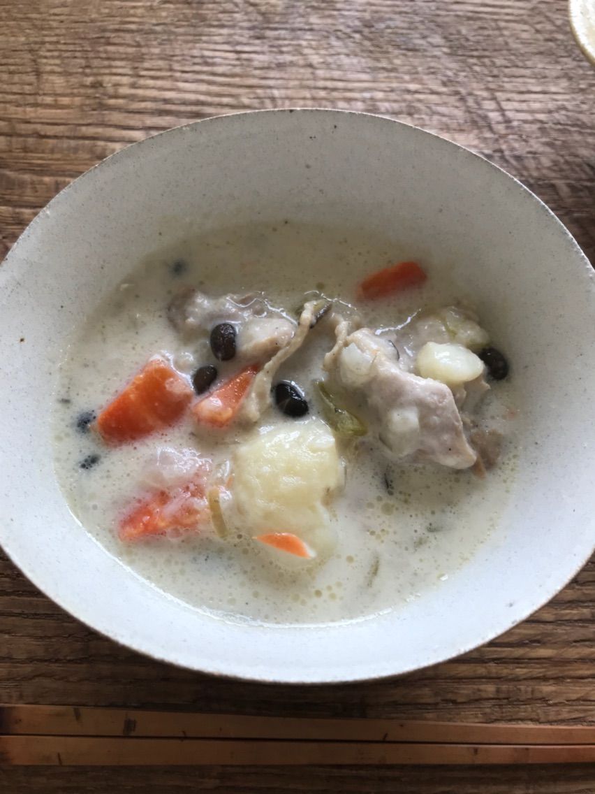 次に、じゃがいも、にんじん、セロリ、玉ねぎ、しめじ、鶏もも肉、黒千石、生クリーム でチキンフリカッセも作りました。これは息子が包丁してくれました。IH圧力なべを使いました。