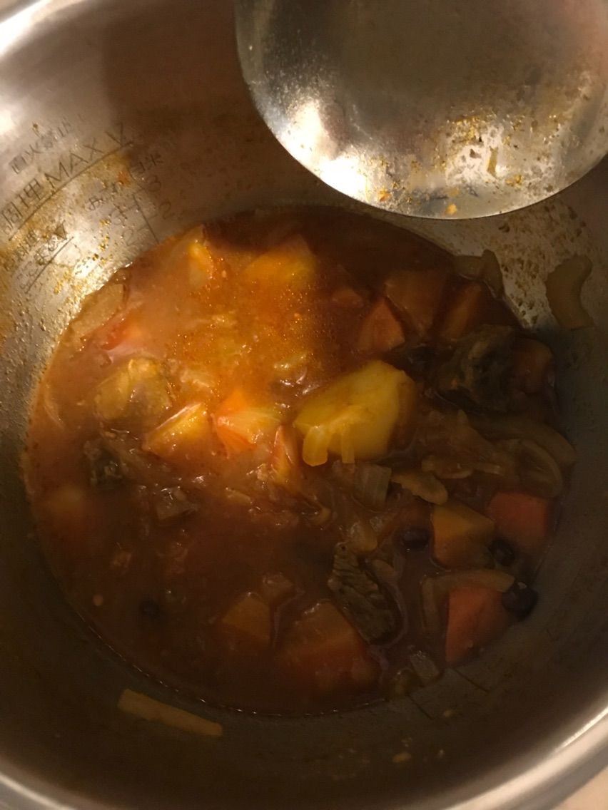 最後の最後で、残った玉ねぎ、にんじん、じゃがいも、セロリ、黒千石、牛肉 でインドカレーを作りました。