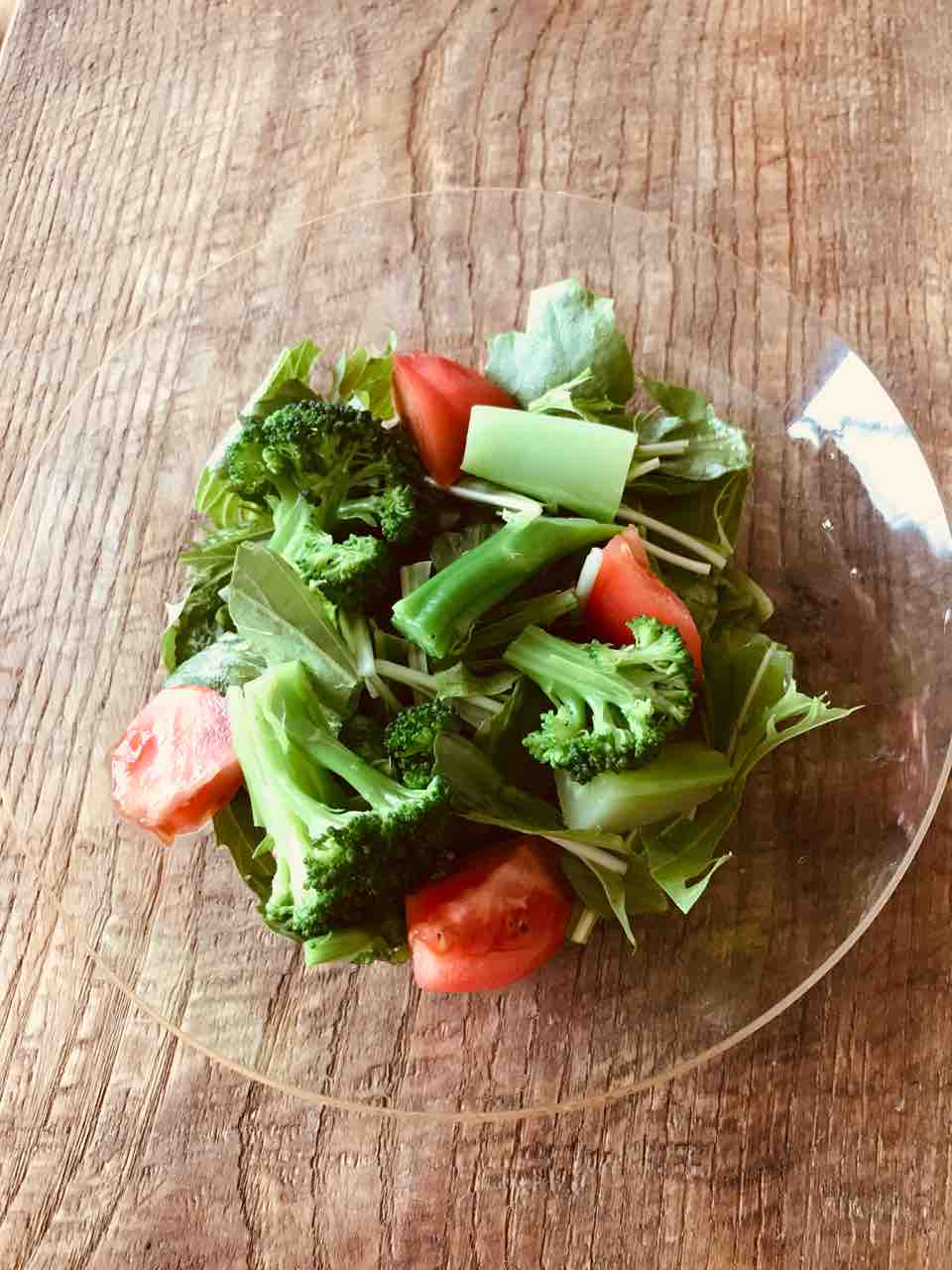 早速サラダを盛ってみました。レタス、水菜、ブロッコリー、大葉、トマト のサラダです。