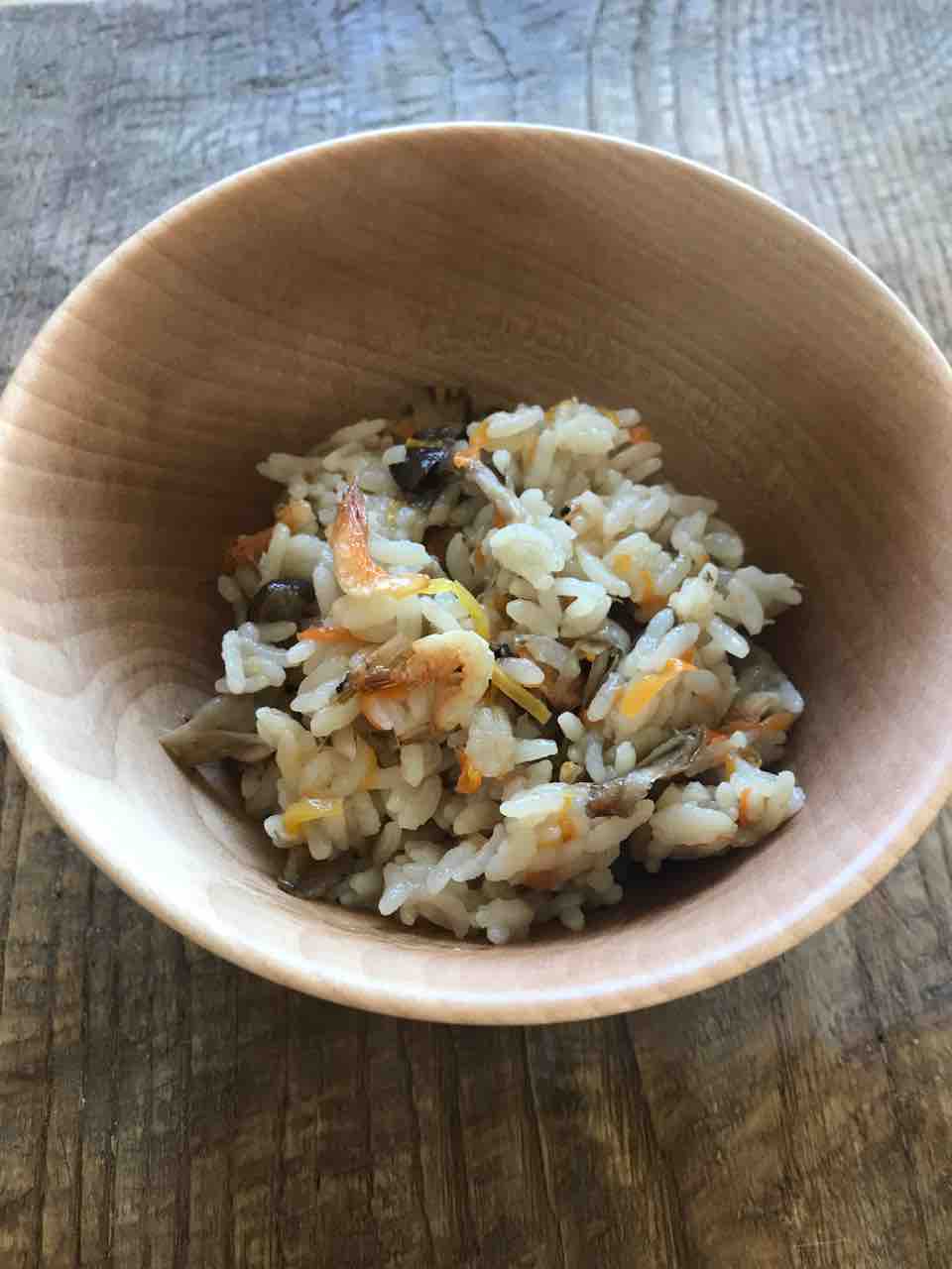 桜海老、にんじん、ごぼう、しめじ で炊き込みご飯も炊きました。