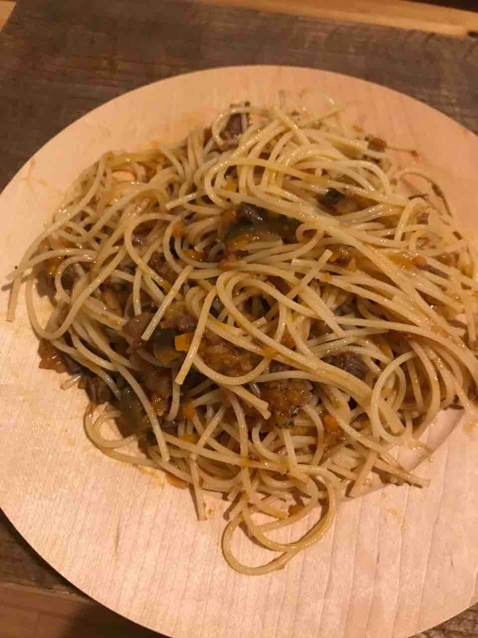ミルポワ(玉ねぎ、にんじん、セロリ、にんにく)、黒毛和牛カレー用肉、有機トマトピューレ で濃厚なミートソースを作りました。牛肉は最後にフードプロセッサーにかけて細かくして戻しました。