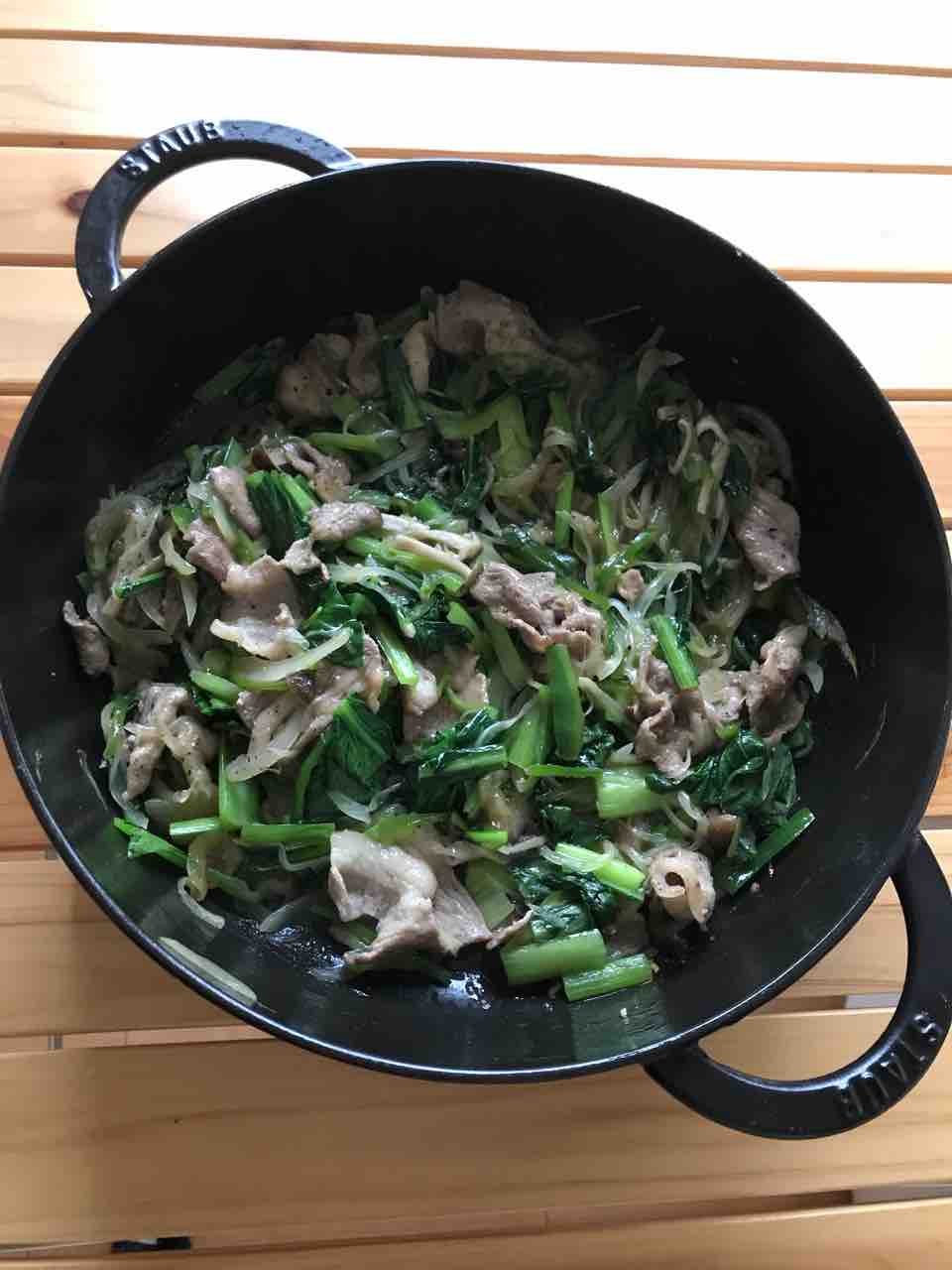 豚肉、小松菜、玉ねぎ、しめじ で肉野菜炒めも作りました。オイスターソースで味付けしました。
