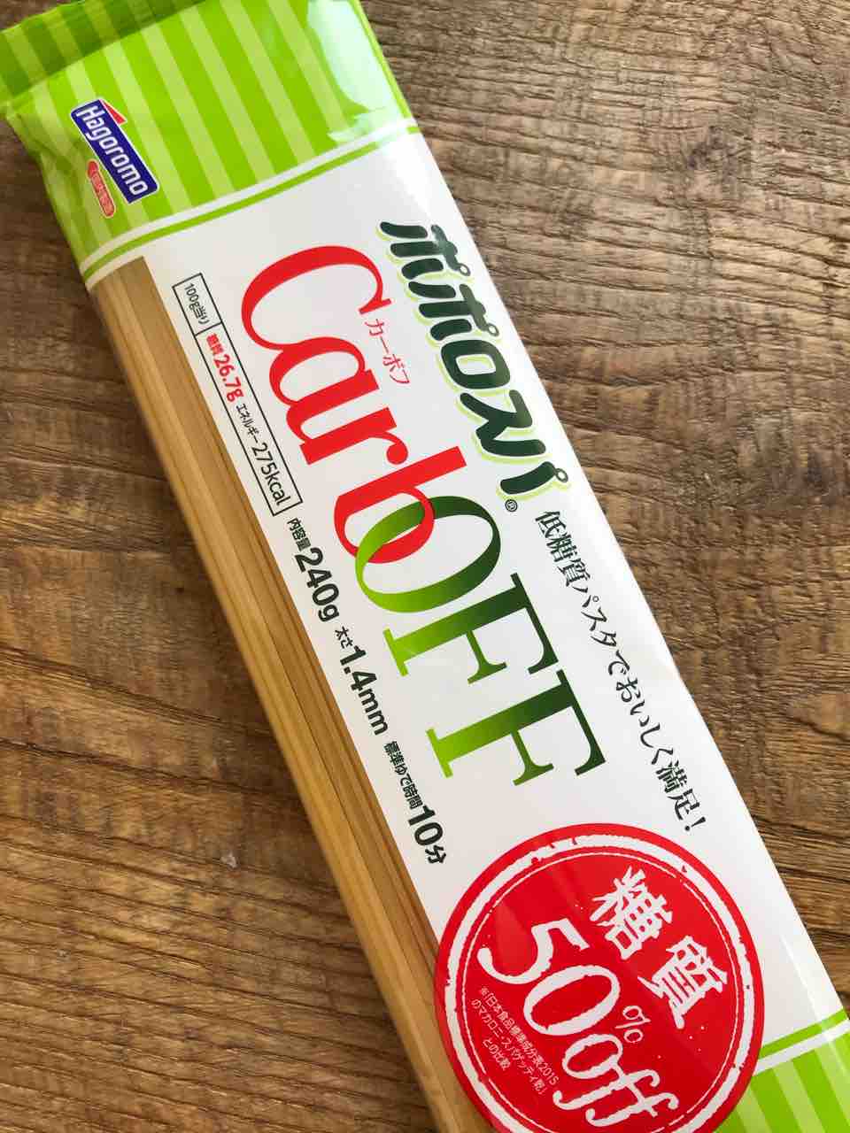 しかし、はごろも から、「ポポロスパ CarbOFF カーボフ」が売り出され、最寄りのスーパーで簡単に手に入るようになりました。糖質50%オフで、乾麺100gあたりの糖質量が26.7gだそうです。