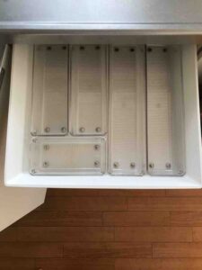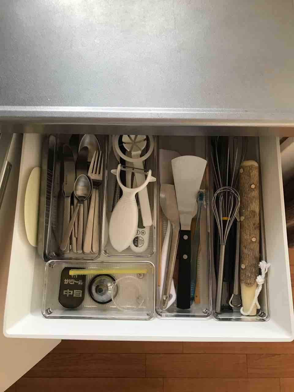 これまでは、カトラリーや調理器具をなんとなくざっくり入れてましたが、今回ちゃんと仕切りを入れて改善してみました。