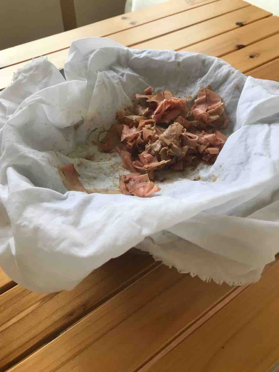 ボウルに浅型のザルをセットしてさらしを敷き、出汁を濾します。