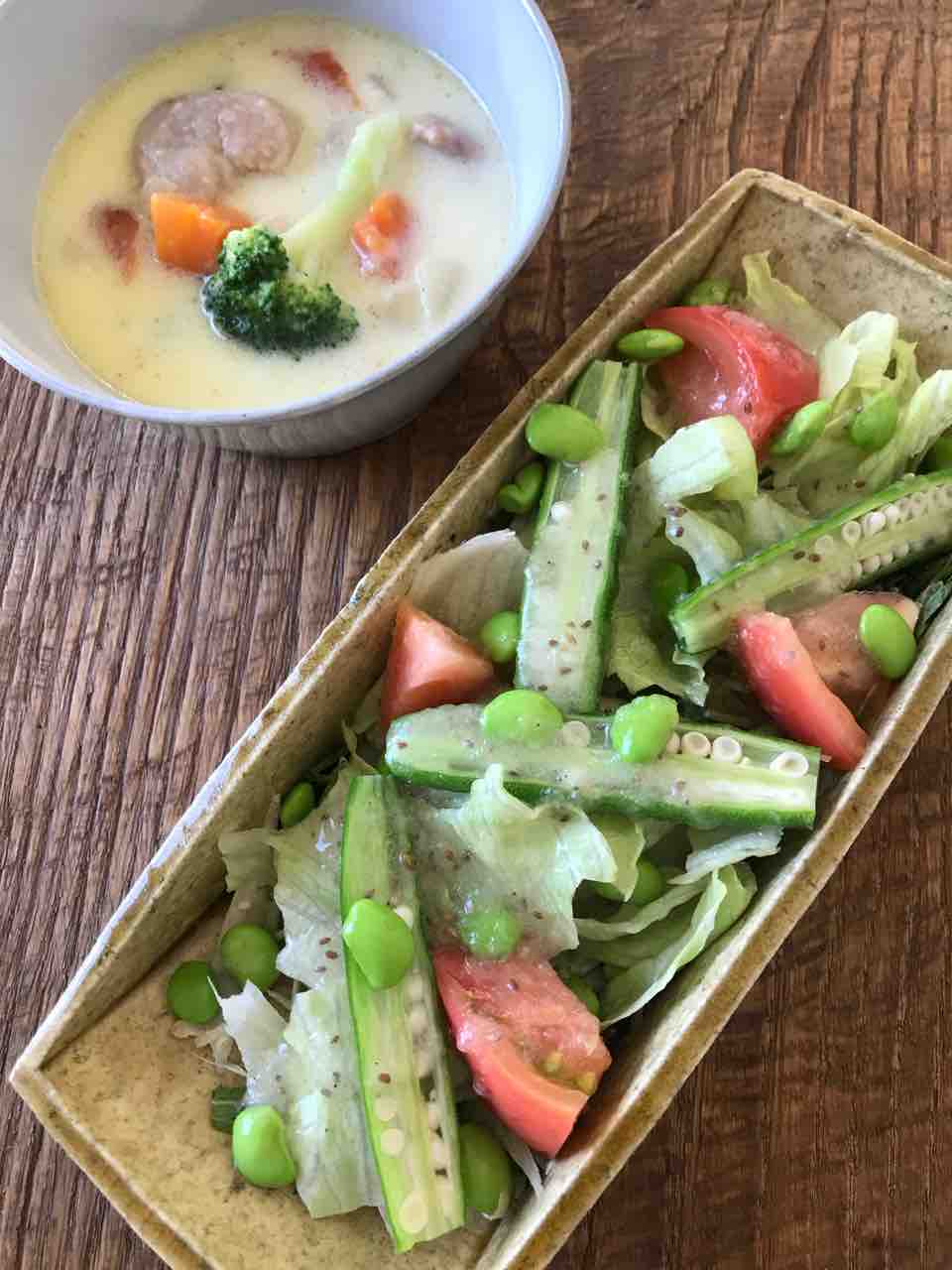 レタス、トマト、おくら、枝豆 でサラダを作りました。
