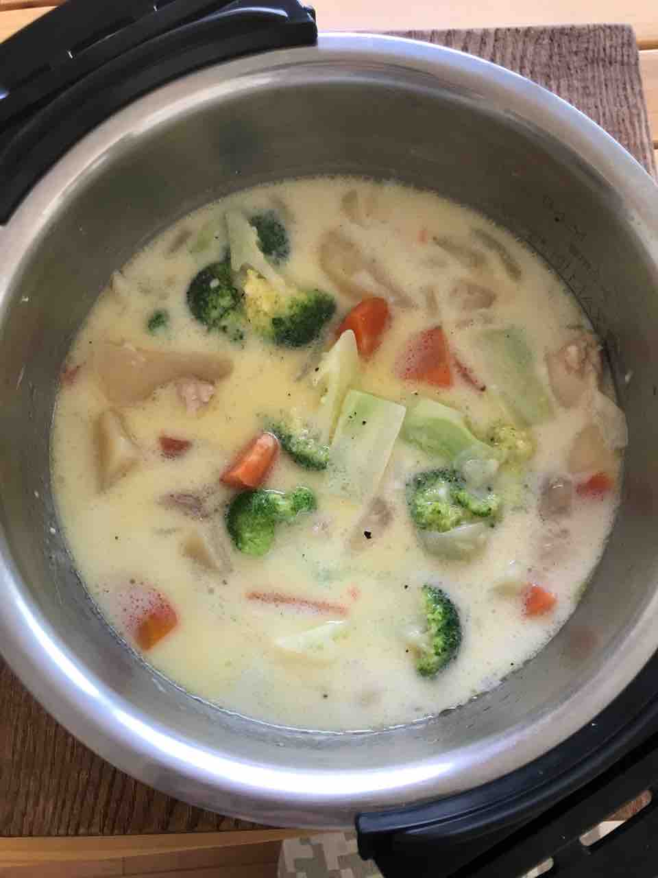 IH圧力なべで仕込み、煮汁を取り出してホワイトソースを作って戻しました。