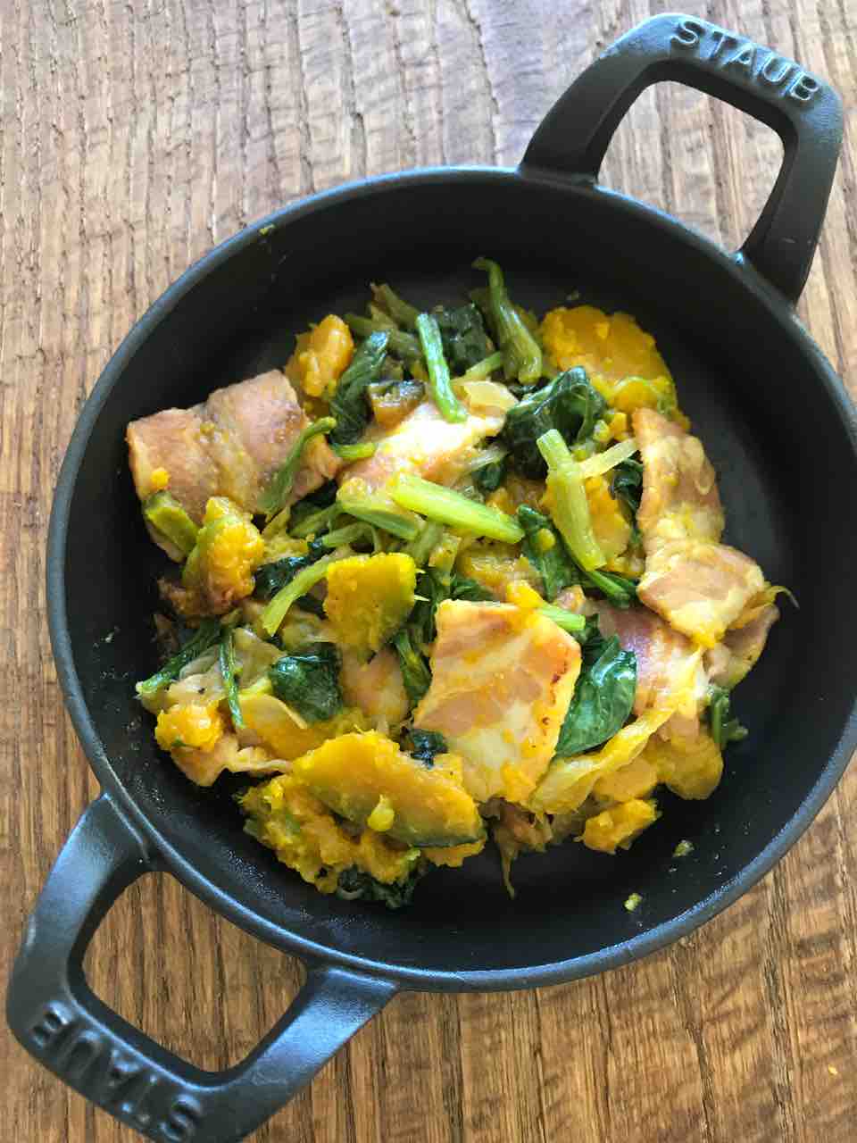 ベーコン、ほうれん草、かぼちゃ、たまねぎ でも洋風の炒め物を作りました。
