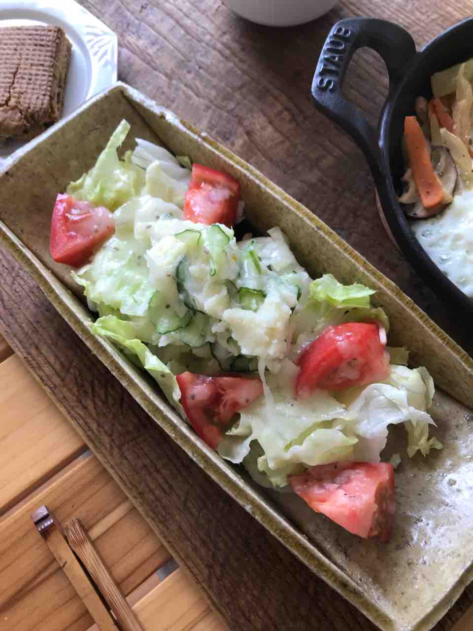 そのポテトサラダ、レタス、トマト でサラダを作りました。