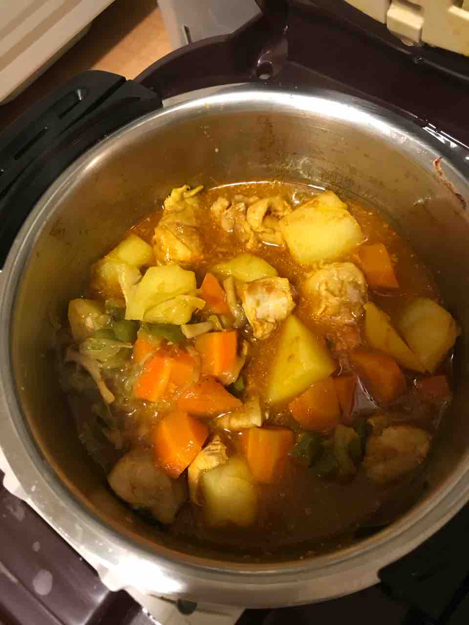 鶏もも肉、たまねぎ、にんじん、じゃがいも、ピーマン、しめじ、有機トマトピューレ でチキンカレーを作りました。火入れは電気IH圧力なべにお任せしちゃいました!