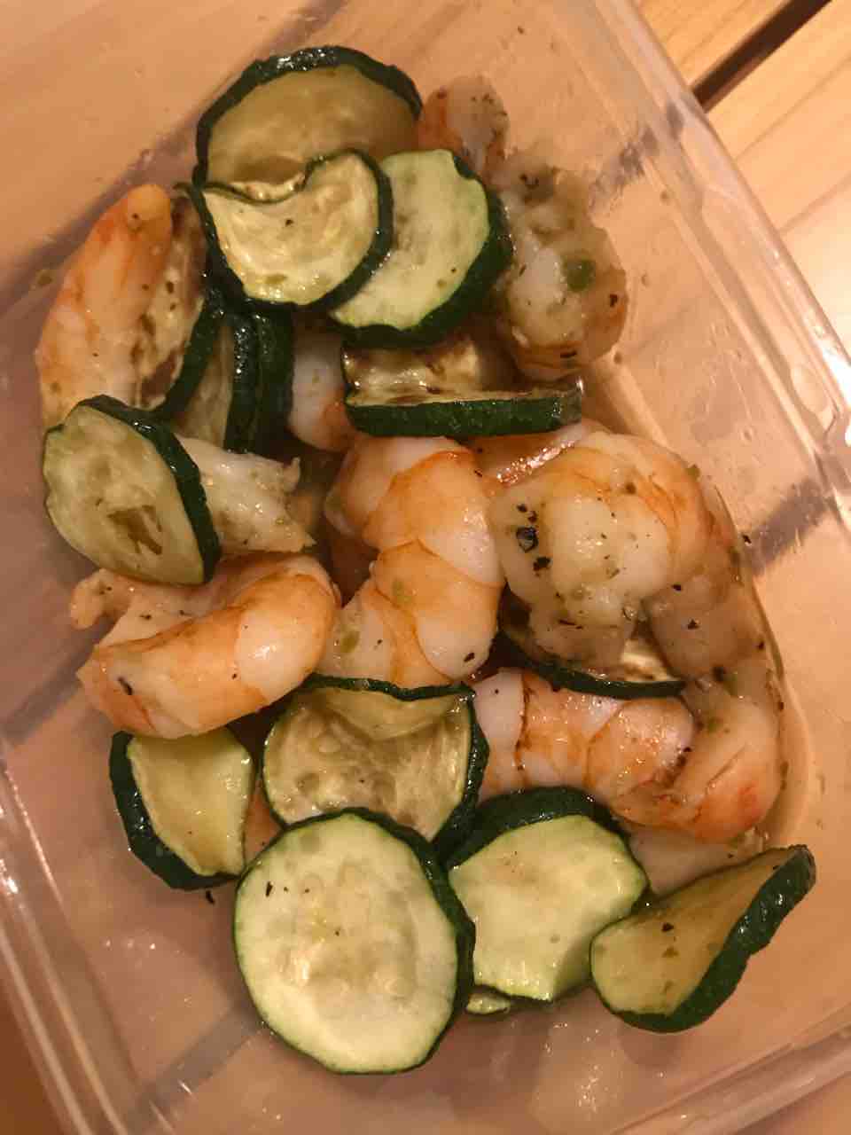ズッキーニ、エコシュリンプ、ライム唐辛子 でマリネも作りました。ズッキーニはソテーパンで焼きつけ、エコシュリンプにライム唐辛子をまぶしてジップロックに入れ、電気IH圧力なべの温度調理で60℃15分火入れしました。