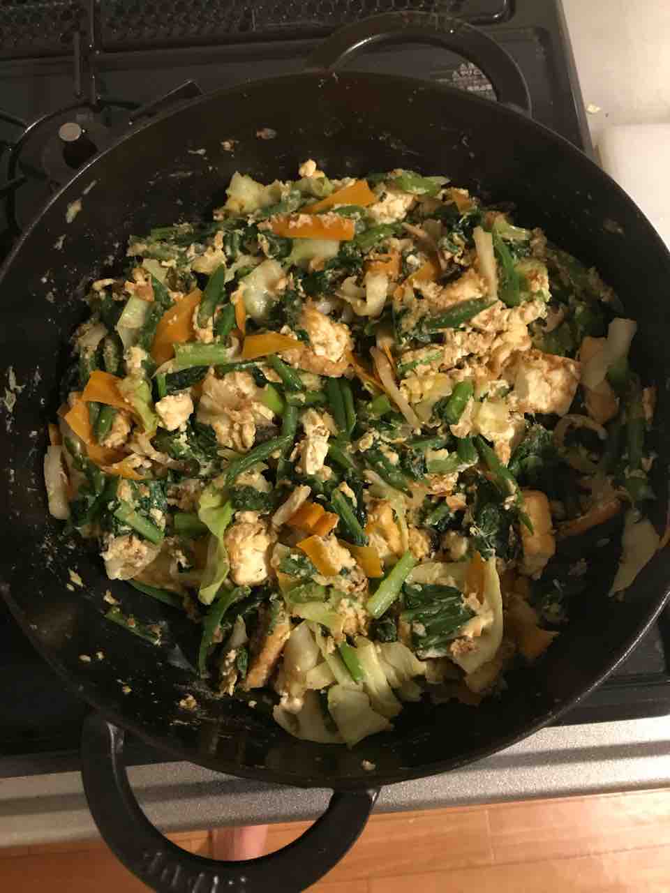 厚揚げ、卵、小松菜、キャベツ、にんじん、いんげん豆 でチャンプルーも作りました。