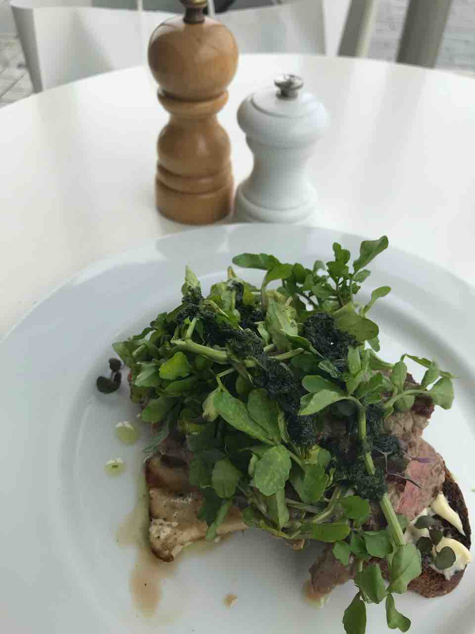 クレソン、タラゴンドレッシング、ミディアムウェルのステーキ、エリンギ、キャラウェイ風味のパン が重なっていました。