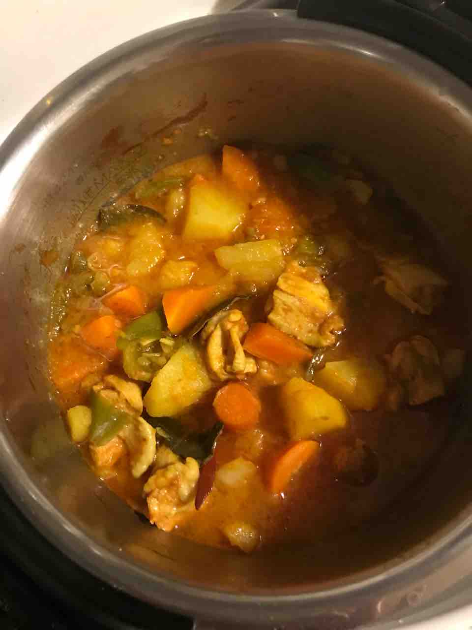 鶏もも肉、たまねぎ、にんじん、ピーマン、じゃがいも、有機トマトピューレ でチキンカレーも作りました。こちらもIH圧力なべで自動調理しました。