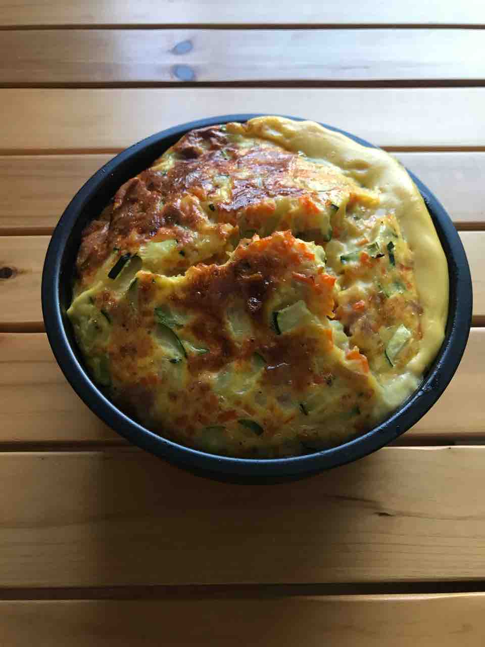 卵、ベーコン、たまねぎ、にんじん、ズッキーニ でスペイン風オムレツを作りました。いつもはストウブのピコ・ニダベイユソテーパンを使うのですか、ひっくり返すのが大変なので、型を使ってオーブンで火入れしてみました。