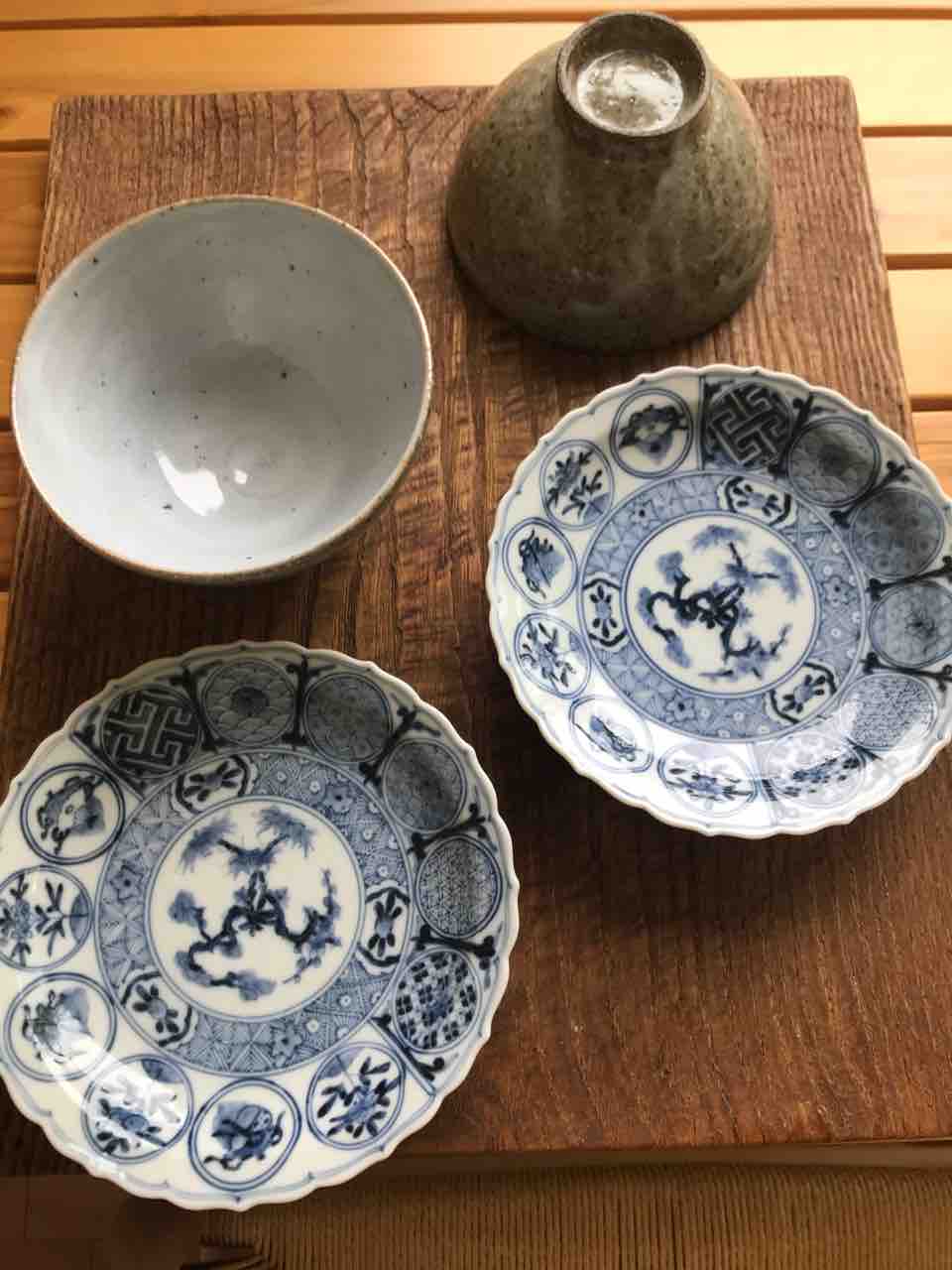 器はいろいろ見て回ったのですが、元々、九谷焼があまり好きではないので、染付の取皿と小さめの飯茶碗にしました。
