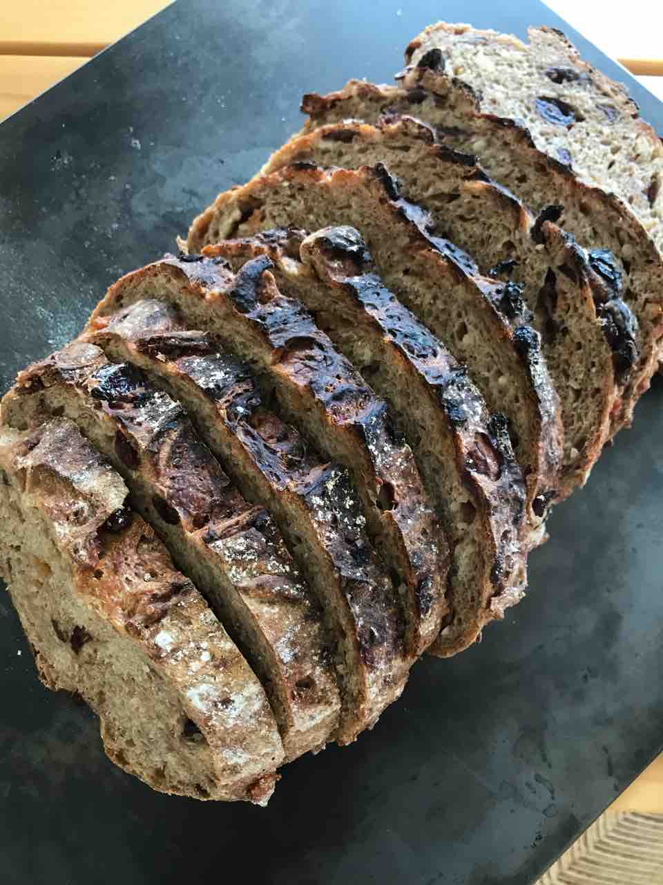 冷蔵庫に眠っていた、自家製のドライフルーツラム酒漬けと残っていた準強力粉、アーモンドダイスを使ってカンパーニュも焼きました。